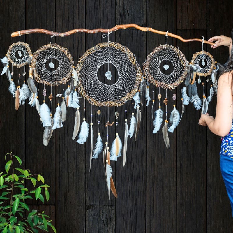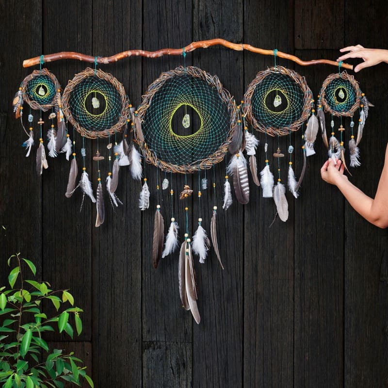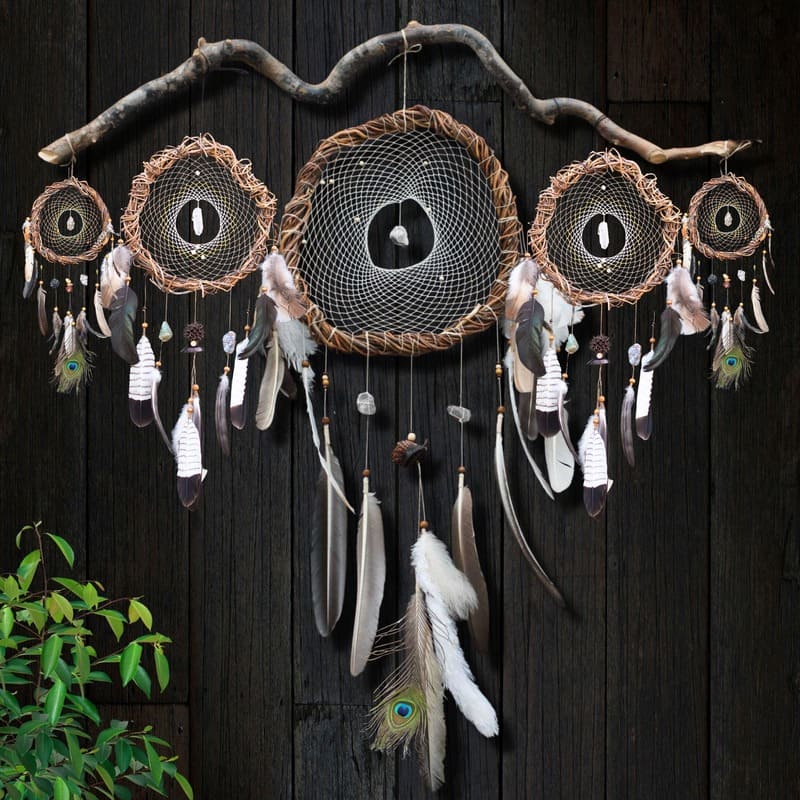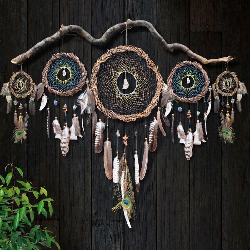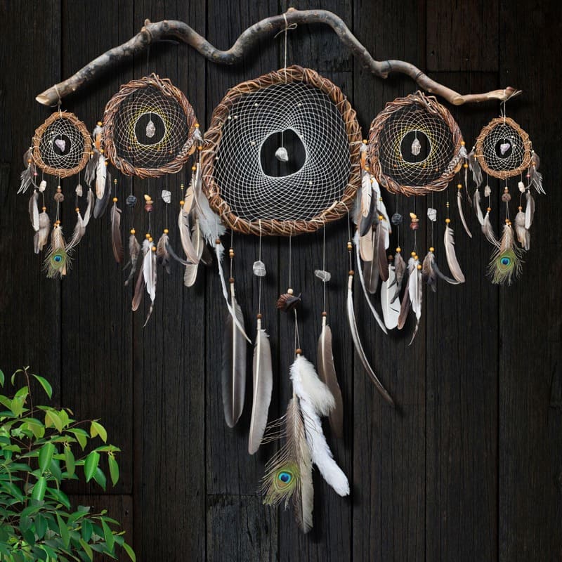 xTransform your space with this premium set of 5 large dreamcatchers, designed to span 47 inches (120 cm) across your wall — ideal for above your bed or sofa. Each dreamcatcher features real quartz crystals for cleansing and protection, combined with natural feathers and soothing earthy tones to bring grounding energy into your home.