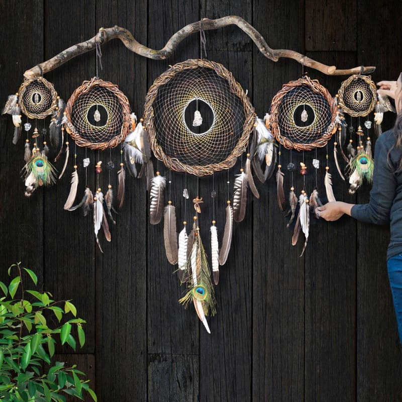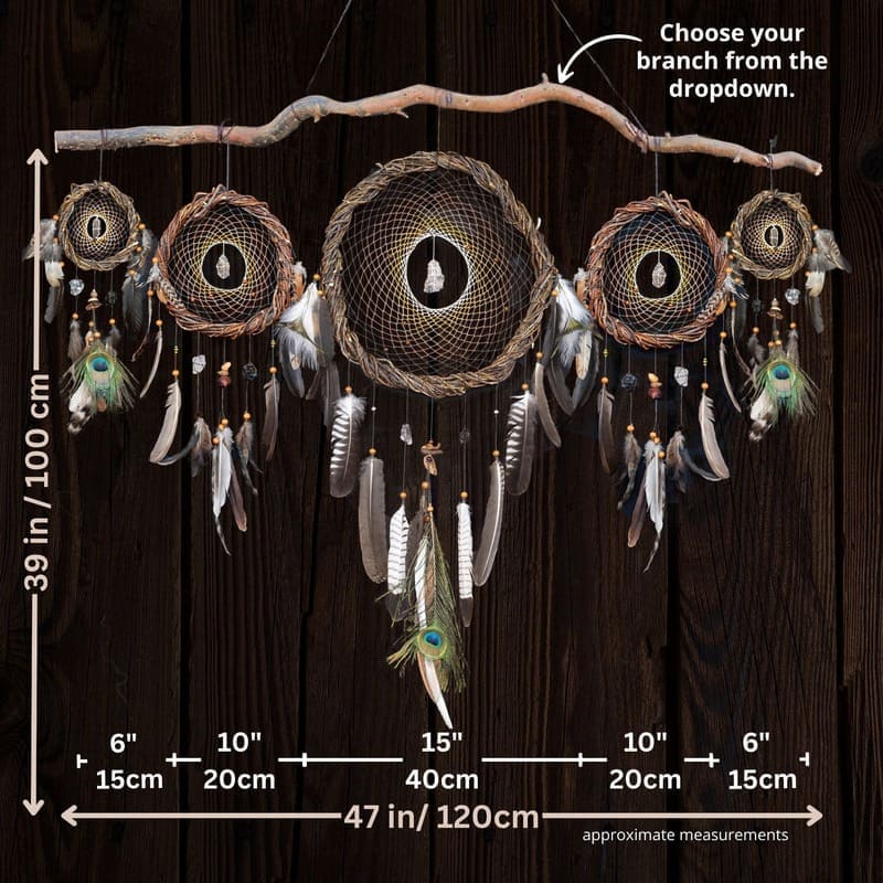Transform your space with this premium set of 5 large dreamcatchers, designed to span 47 inches (120 cm) across your wall — ideal for above your bed or sofa. Each dreamcatcher features real quartz crystals for cleansing and protection, combined with natural feathers and soothing earthy tones to bring grounding energy into your home.