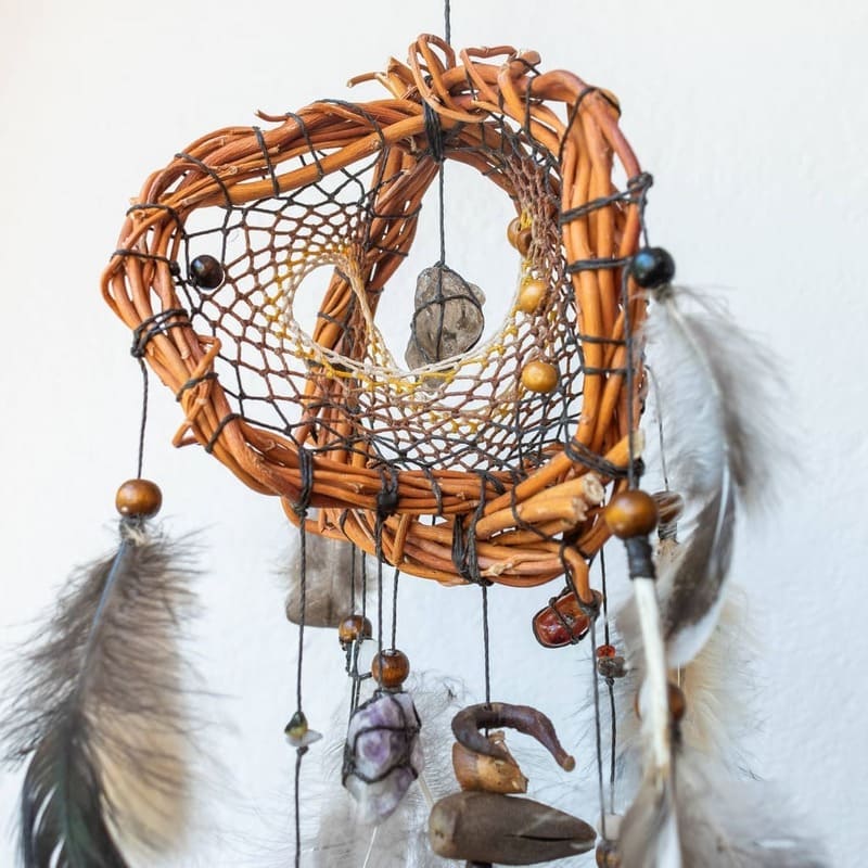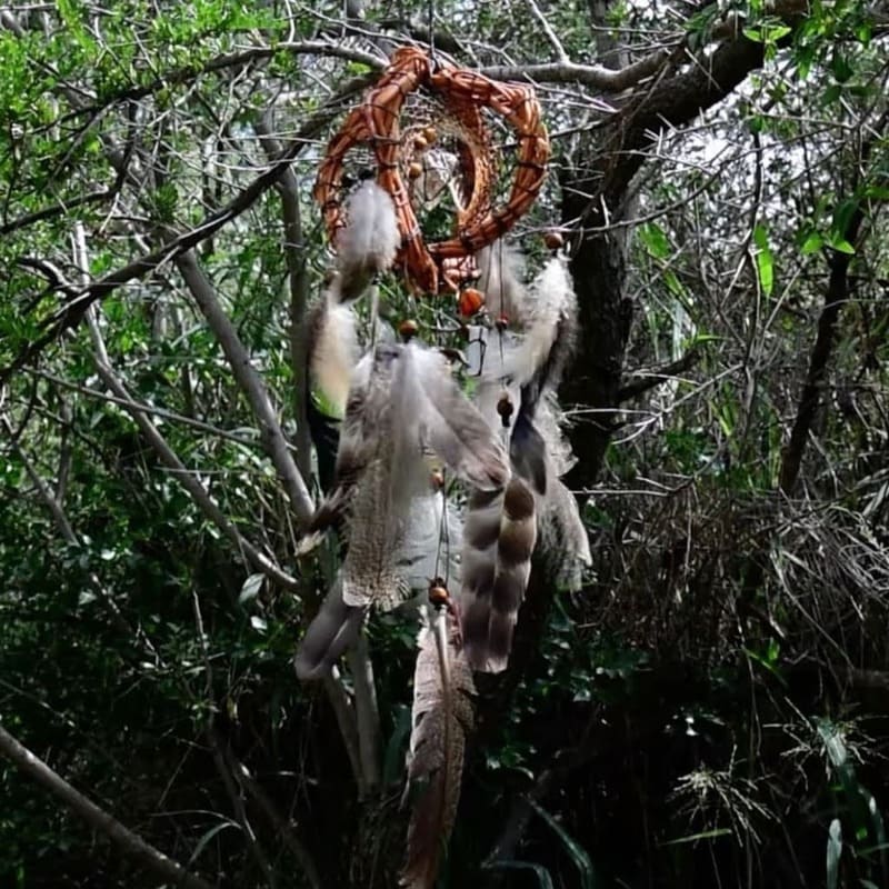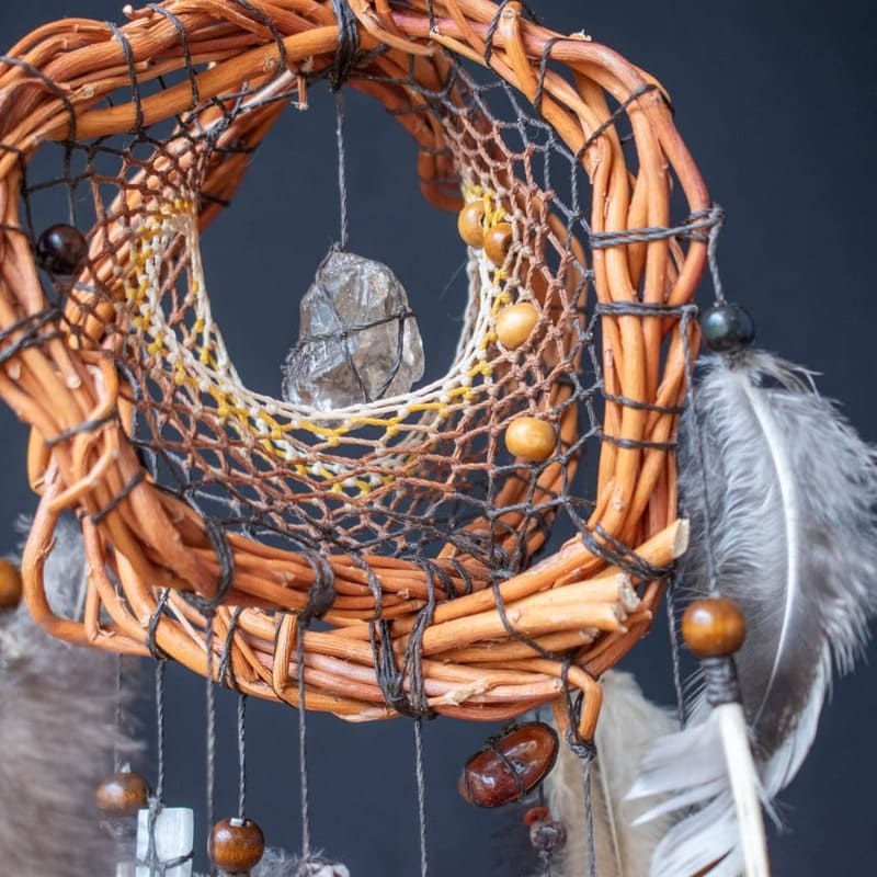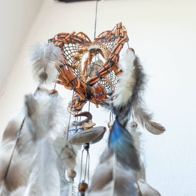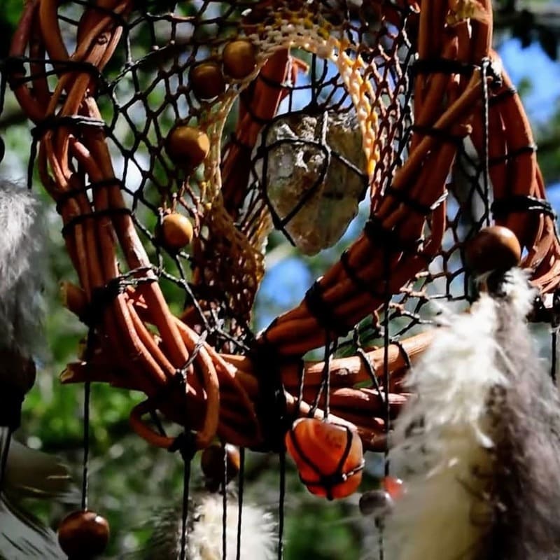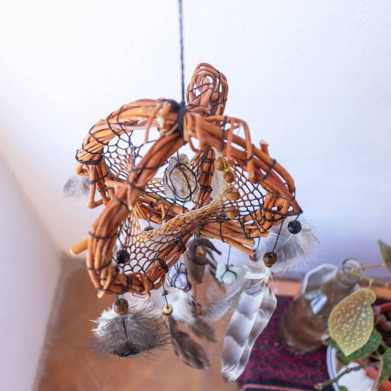 We made it, like all our Dream Catchers, with Willow wood since they were originally made that way, inspired by the beautiful designs of the Native Americans but with a three-dimensional effect that shows how the network maintains its perfect symmetry despite the crazy shape within which it is woven.