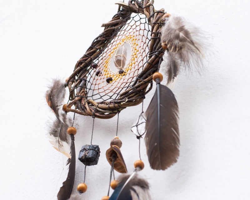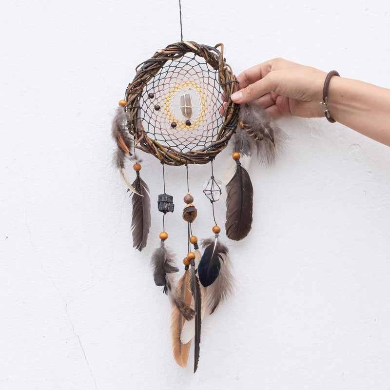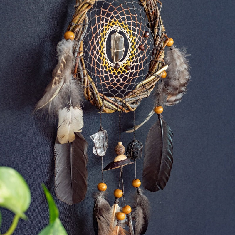 Each dreamcatcher includes one group of 3 powerful crystals, specially selected to support different energetic needs. You can choose the crystal group that aligns best with your intention or energy. We offer 5 different crystal groups, each with a unique healing focus: