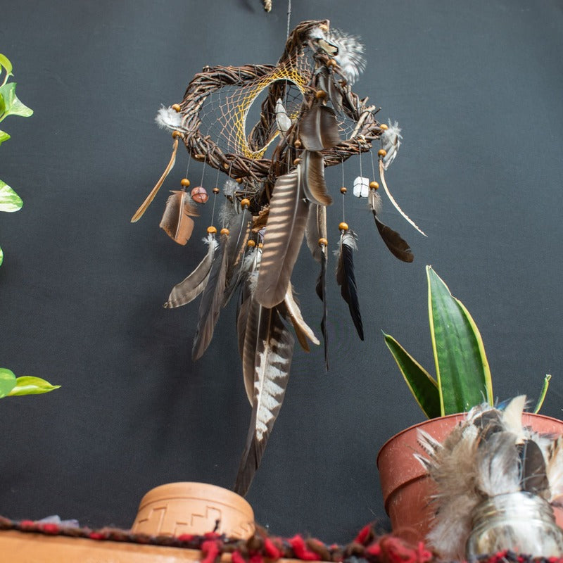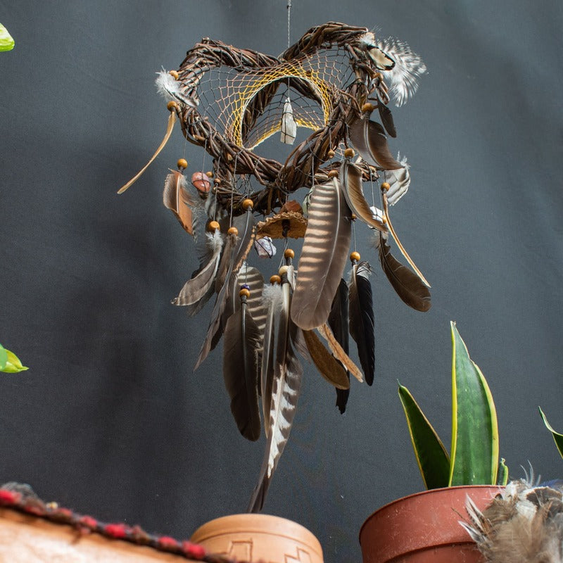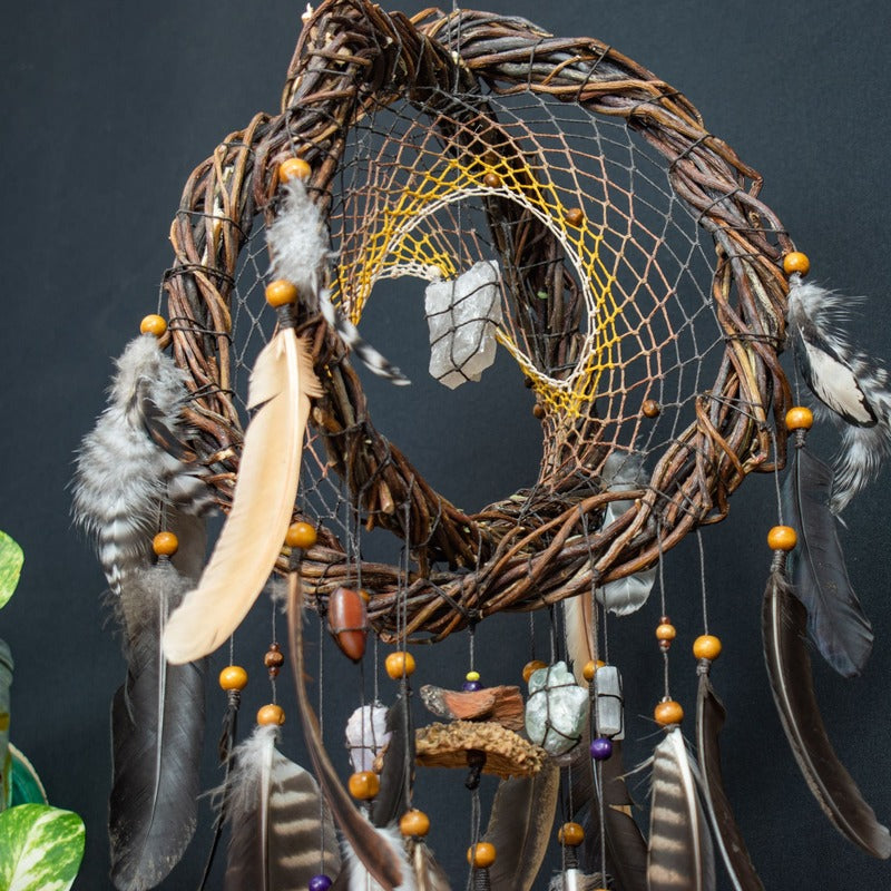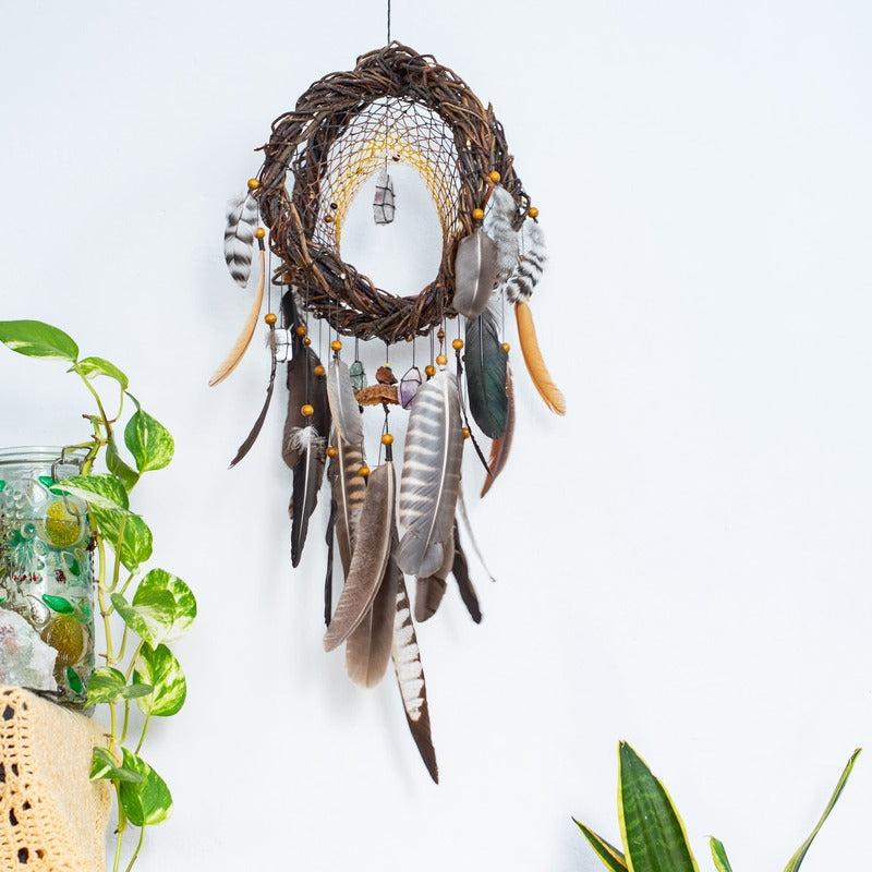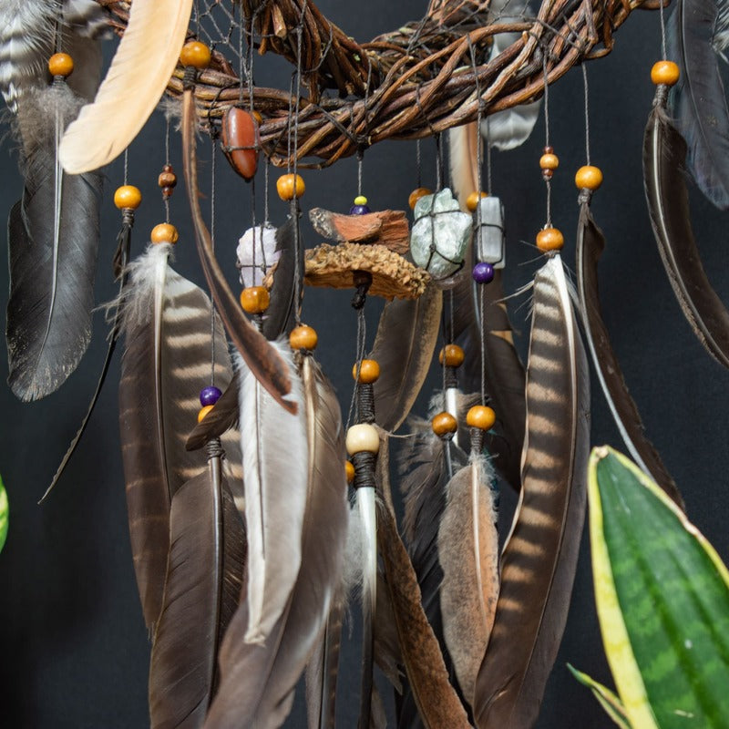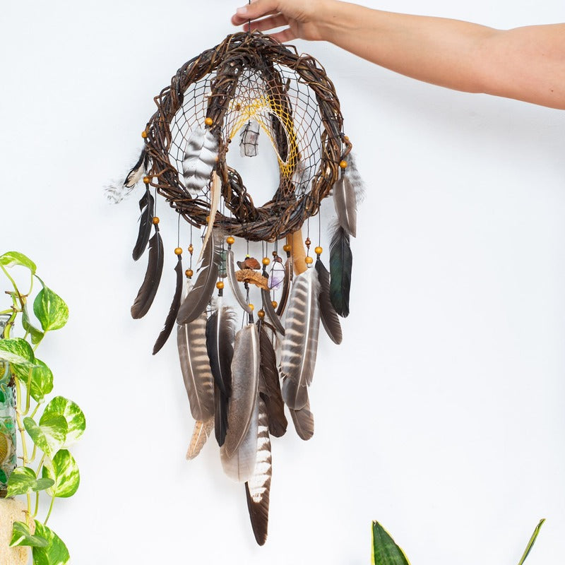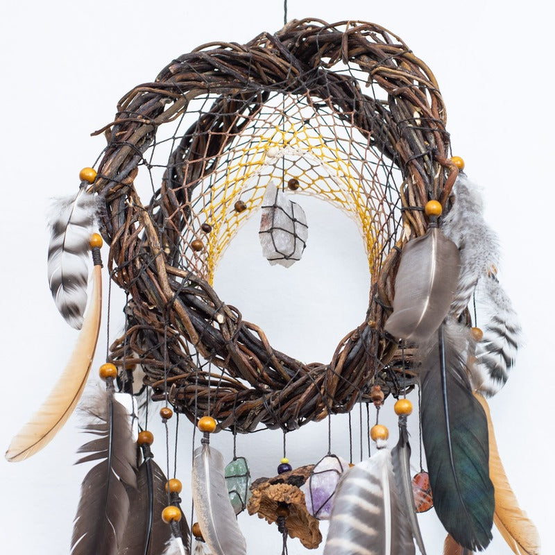 Each of our dreamcatchers is a unique work of art, crafted with natural willow wood, carefully harvested in harmony with the earth. We select natureโs gifted treasures, such as semi-precious stones and seasonal feathers, gathered to ensure respect for the environment and its renewal. Each piece is infused with healing energy, crafted with intention and dedication so that you can suggest your own wishes for protection, peace, and clarity.
