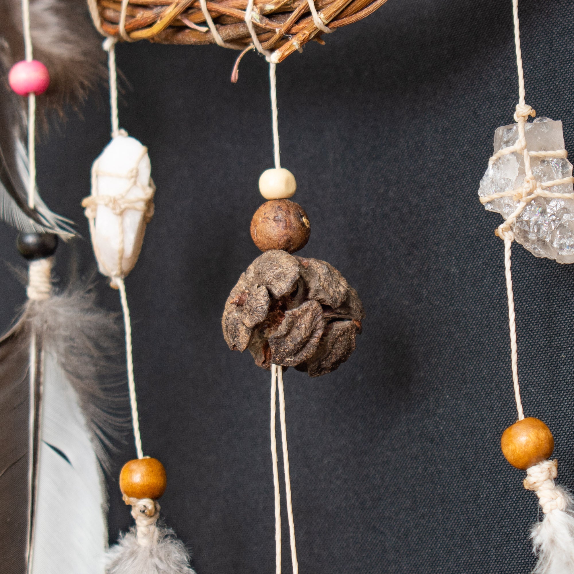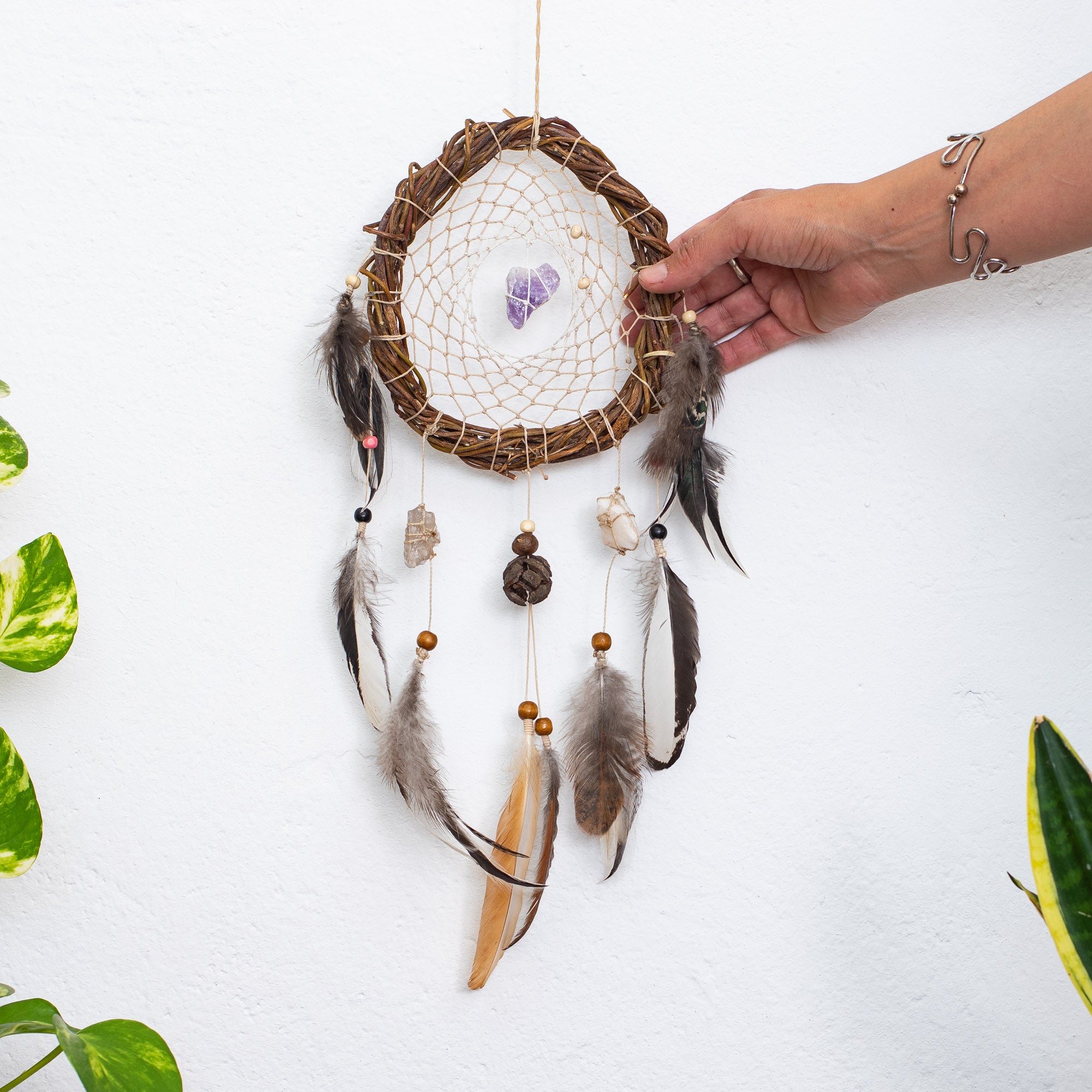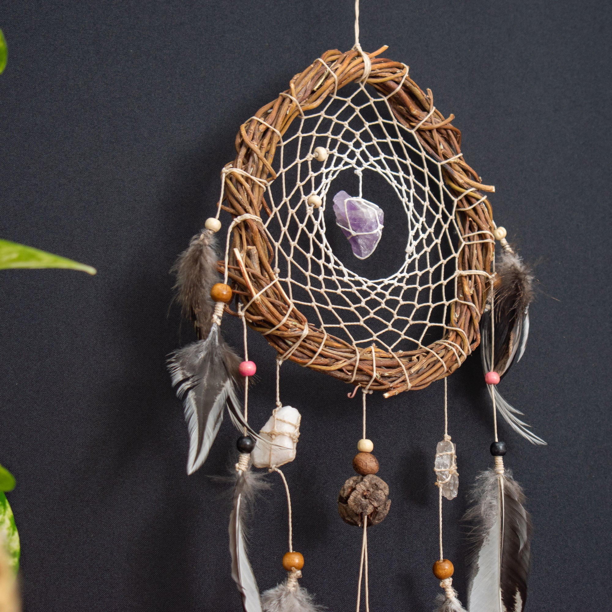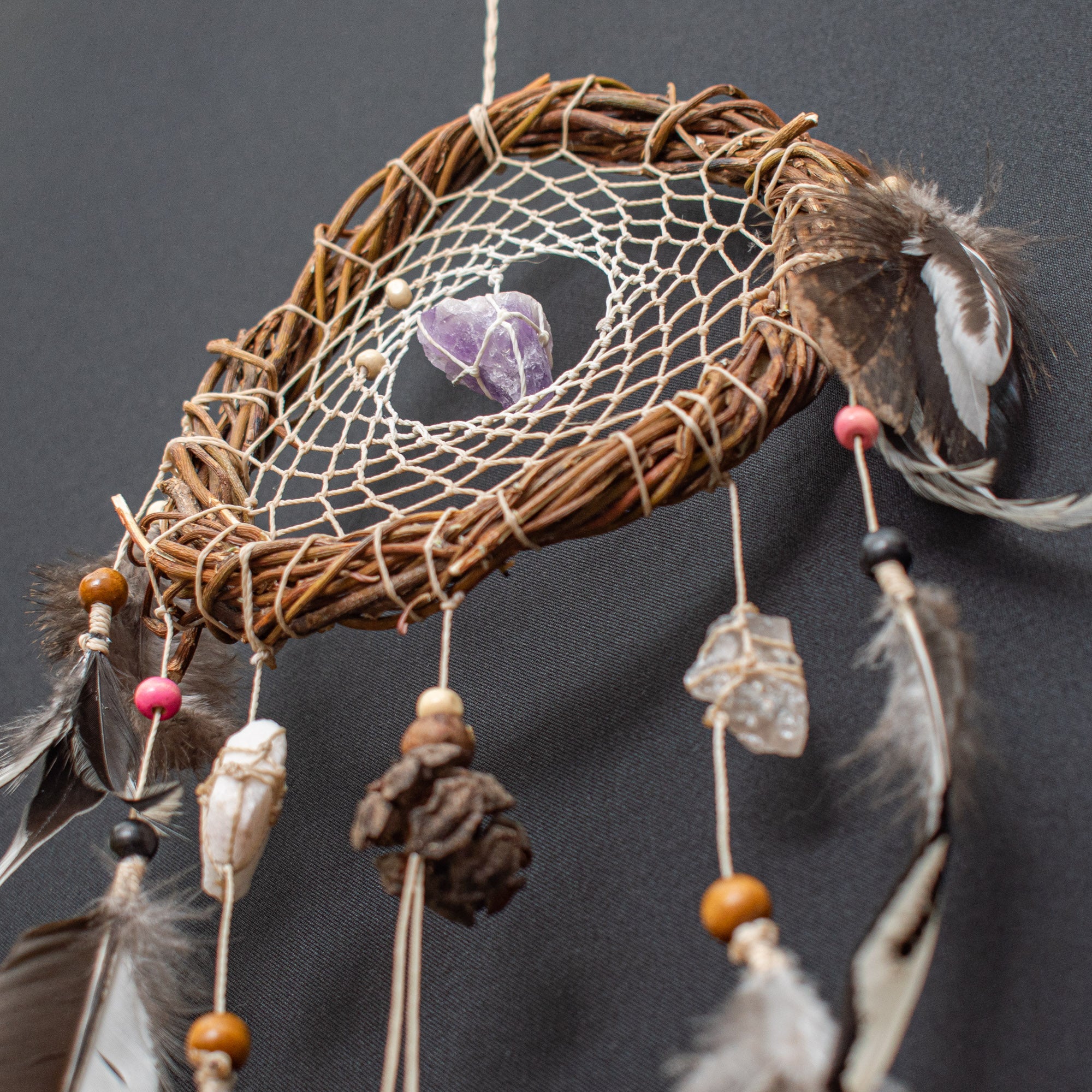 Each dreamcatcher includes one group of 3 powerful crystals, specially selected to support different energetic needs. You can choose the crystal group that aligns best with your intention or energy. We offer 5 different crystal groups, each with a unique healing focus: