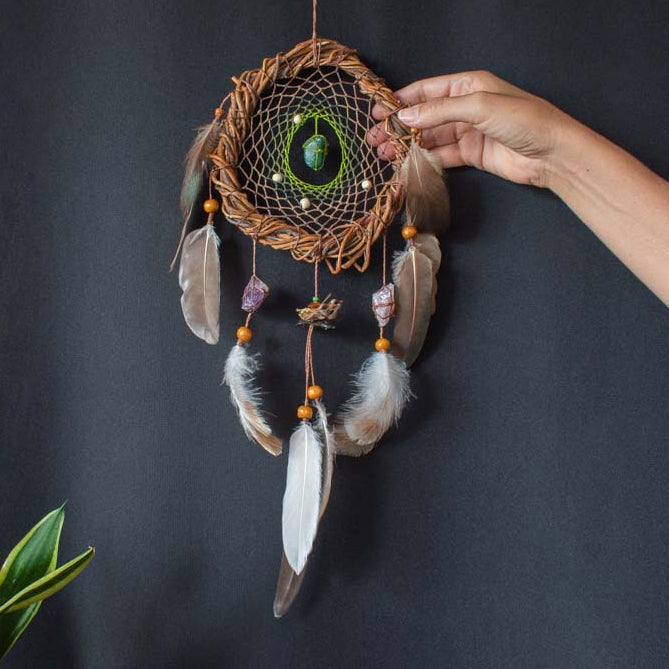 xTransform your space with our Authentic Willow Dreamcatcher, a handcrafted talisman designed for high-vibration protection. This edition highlights the Cloud Forest palette—a rich blend of mossy greens and earthy browns—artfully woven on traditional willow wood. To ensure this piece resonates with your personal intent, you can choose between 5 unique gemstone combinations, each selected for its specific protective properties. Available in 7 exclusive colorways, including our serene Bone White and Natural Sand, this 6-inch door hanging is a premium, shamanic alternative to mass-produced decor, crafted with ethically sourced materials.