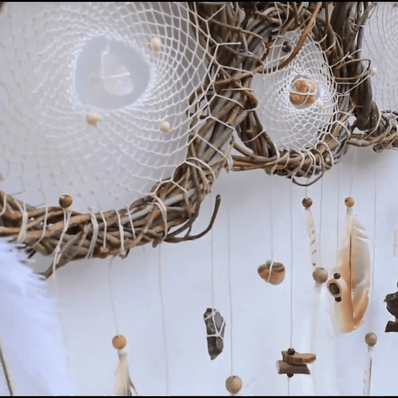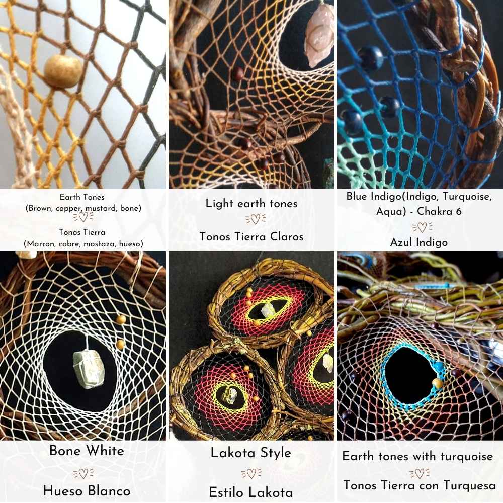 En este diseño mágico y reconfortante, nos enfocamos en lograr un arte sanador Atrapasueños Protector de la Negatividad, Tejemos estos 10 Atrapasueños en una estructura rústica, muy creativa, única e irrepetible, hechos de auténtica madera de sauce logrando un mural de pared de diseño nativo americano con plumas naturales y un juego de piedras metafísicas.