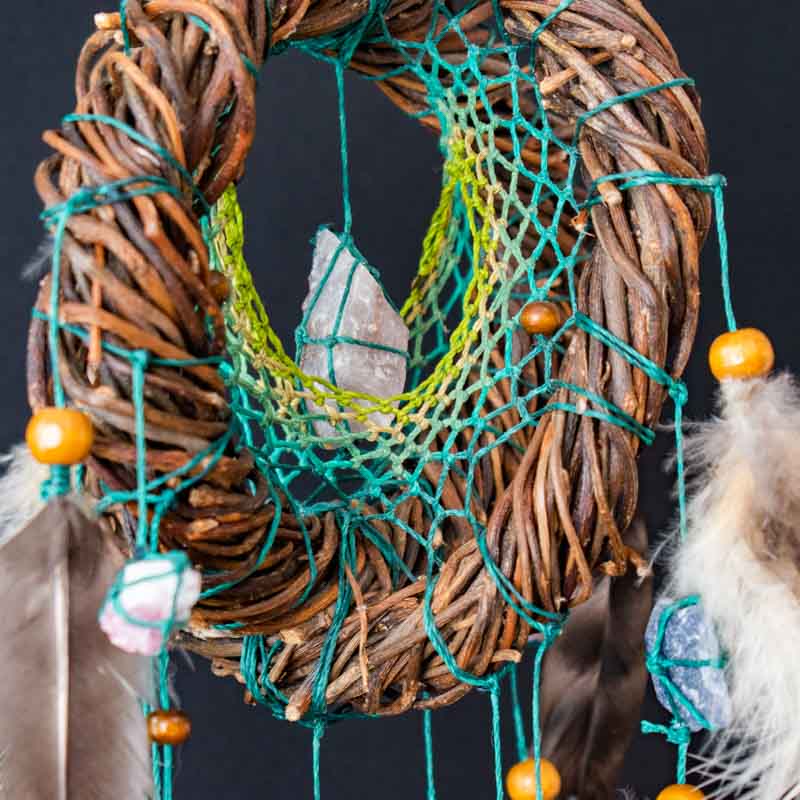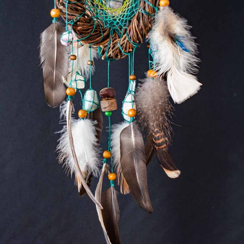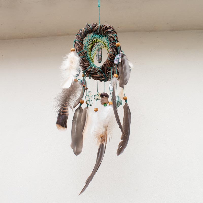 Lo fabricamos, como todos nuestros Atrapasueños, con madera de Sauce ya que originalmente se hacían así, inspirándonos en los bellos diseños de los Nativos Americanos pero con un efecto tridimensional que muestra como la red mantiene su perfecta simetría a pesar de la loca forma dentro del cual se teje.