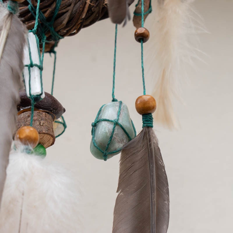 Este Atrapasueños tridimensional, techo móvil, consta de dos anillos entrelazados logrando una bonita y original forma esférica. En el centro de la esfera cuelga una gran y llamativa piedra semipreciosa que seleccionamos según la combinación de colores elegida. 2 piedras semipreciosas también cuelgan debajo junto con un clásico atrapasueños plano.