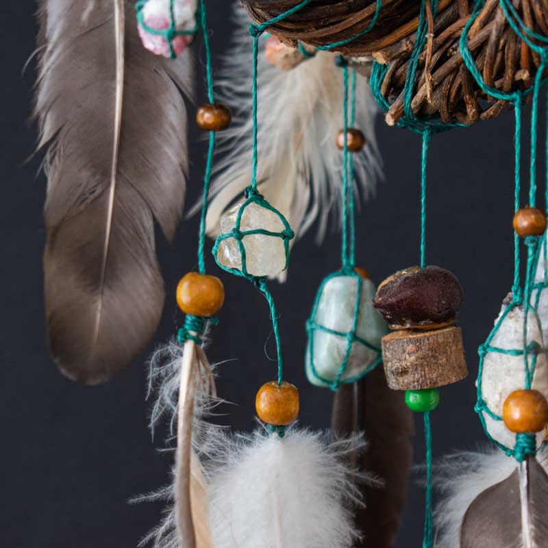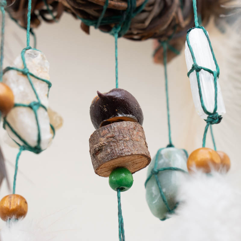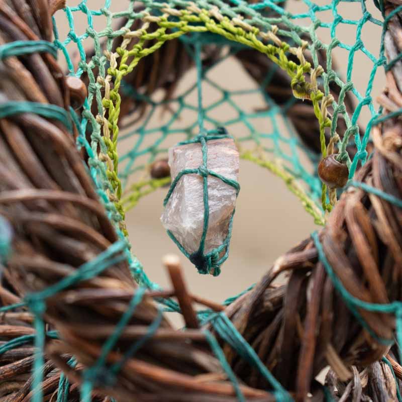 Las redes las tejemos con hilo de primera calidad y en el diseño también usamos escaleras de piedras semipreciosas, semillas, vainas, cuentas de madera, muchas de ellas recolectadas por nosotros de la selva y sierra de Córdoba, Argentina, y las trabajamos a mano. especialmente para el diseño.