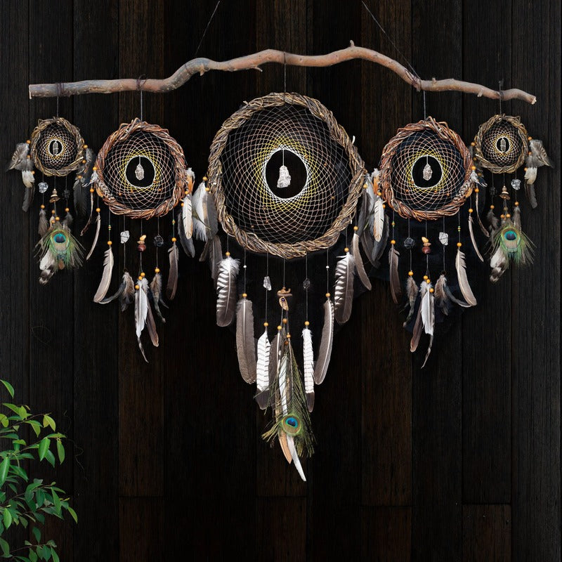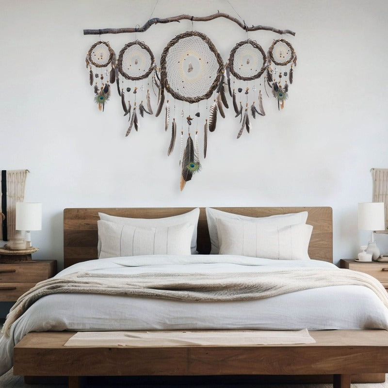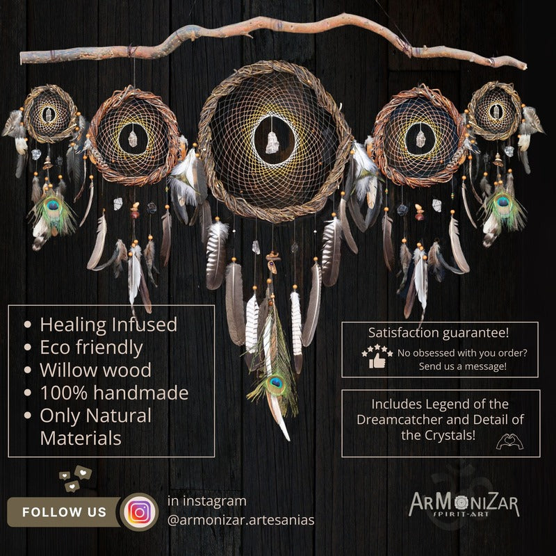 Transform your bedroom or sacred space with this stunning custom dreamcatcher set of 5, spanning the full width of a bed. Handwoven with care and adorned with rare peacock feathers, each piece is unique and deeply symbolic. Choose your favorite gemstone combination and color palette to match your personal energy or the room’s intention.