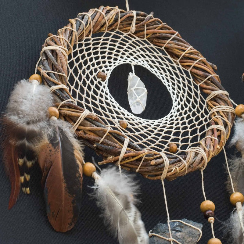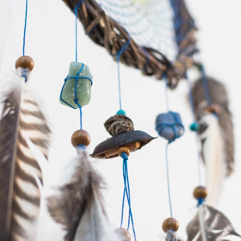x Lot de 3 attrape-rêves faits main en matériaux naturels pour chambre à coucher naturelle. Fabriqué entièrement à la main et avec beaucoup d'amour par des thérapeutes holistiques connectés et attentifs. Tissé en bois de saule, comme l'indique la légende. Décoré de pierres semi-précieuses authentiques et de plumes naturelles de la collection saisonnière (sans souffrance animale).