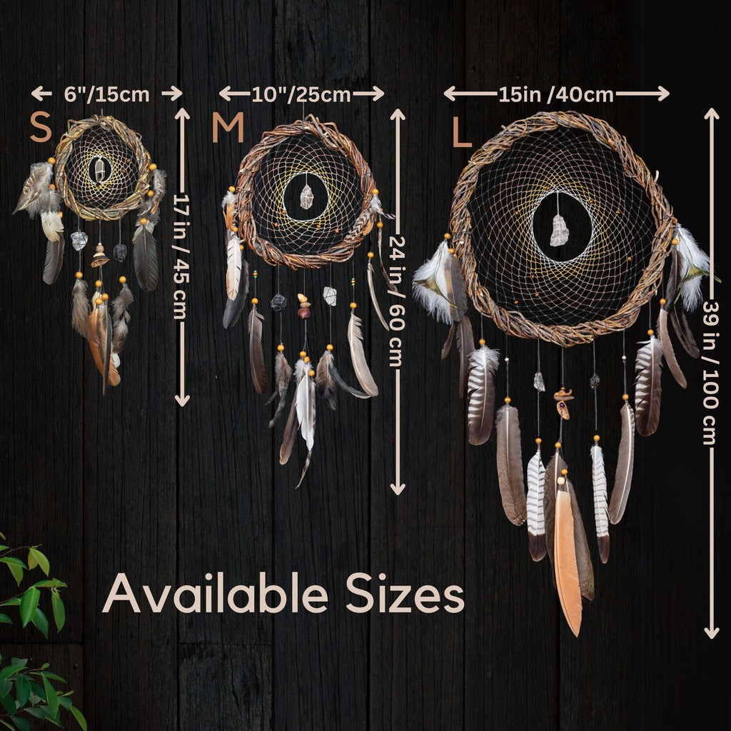 Each dreamcatcher includes one group of 3 powerful crystals, specially selected to support different energetic needs. You can choose the crystal group that aligns best with your intention or energy. We offer 5 different crystal groups, each with a unique healing focus: