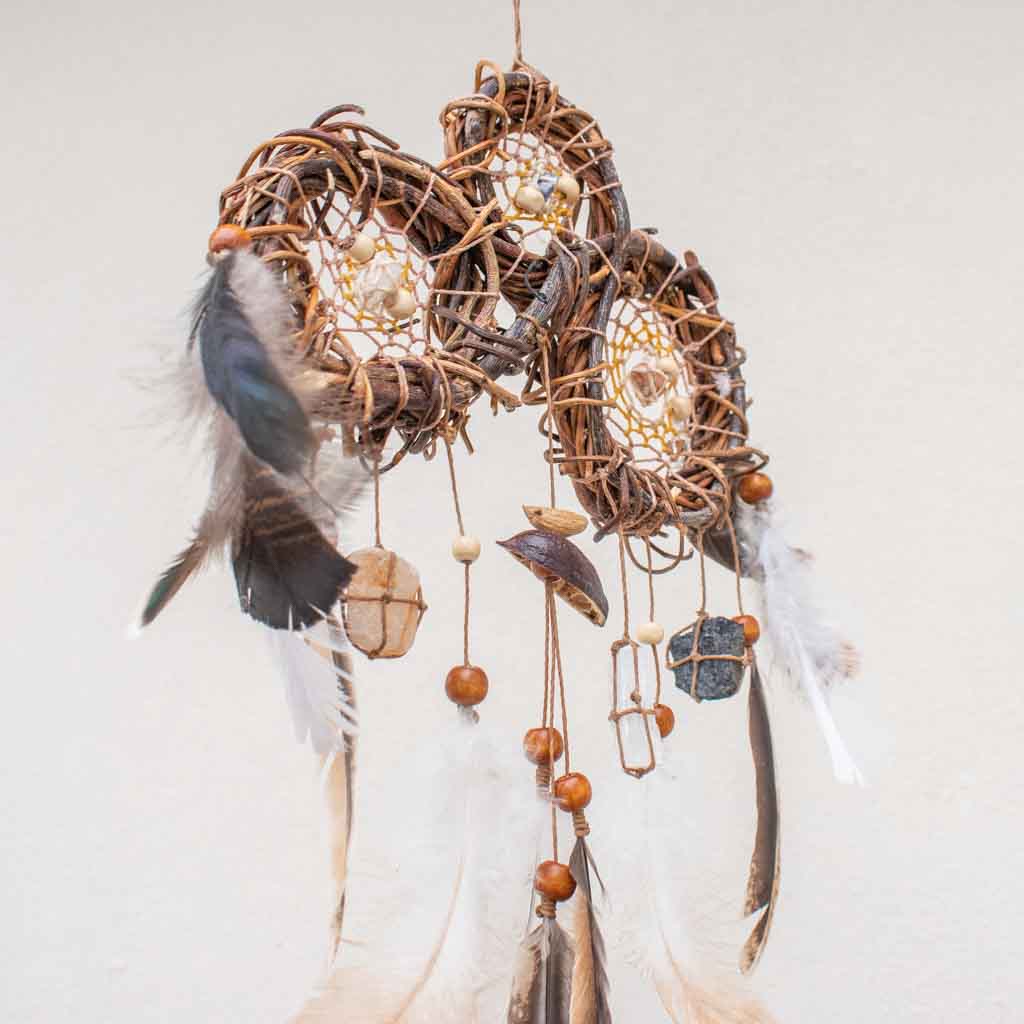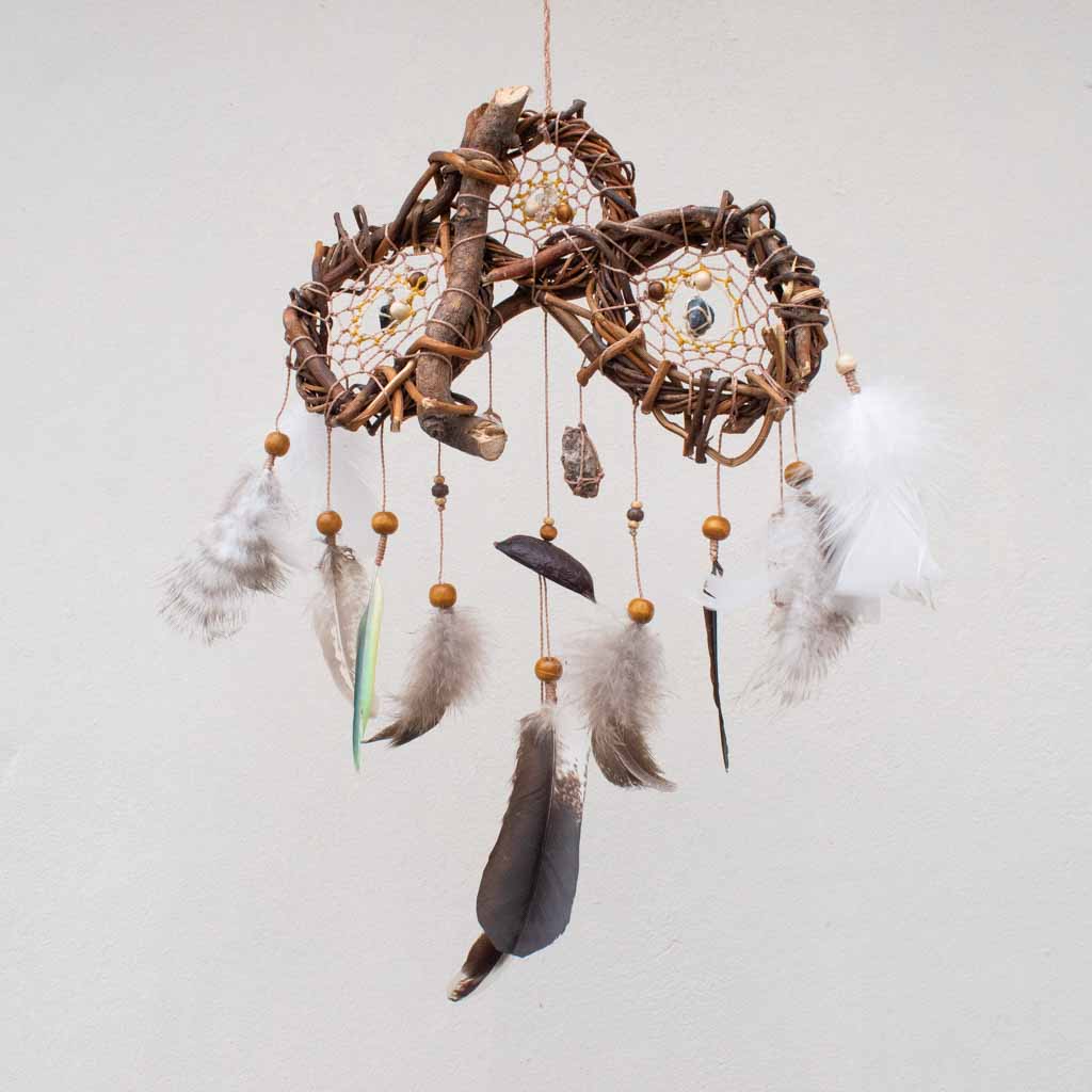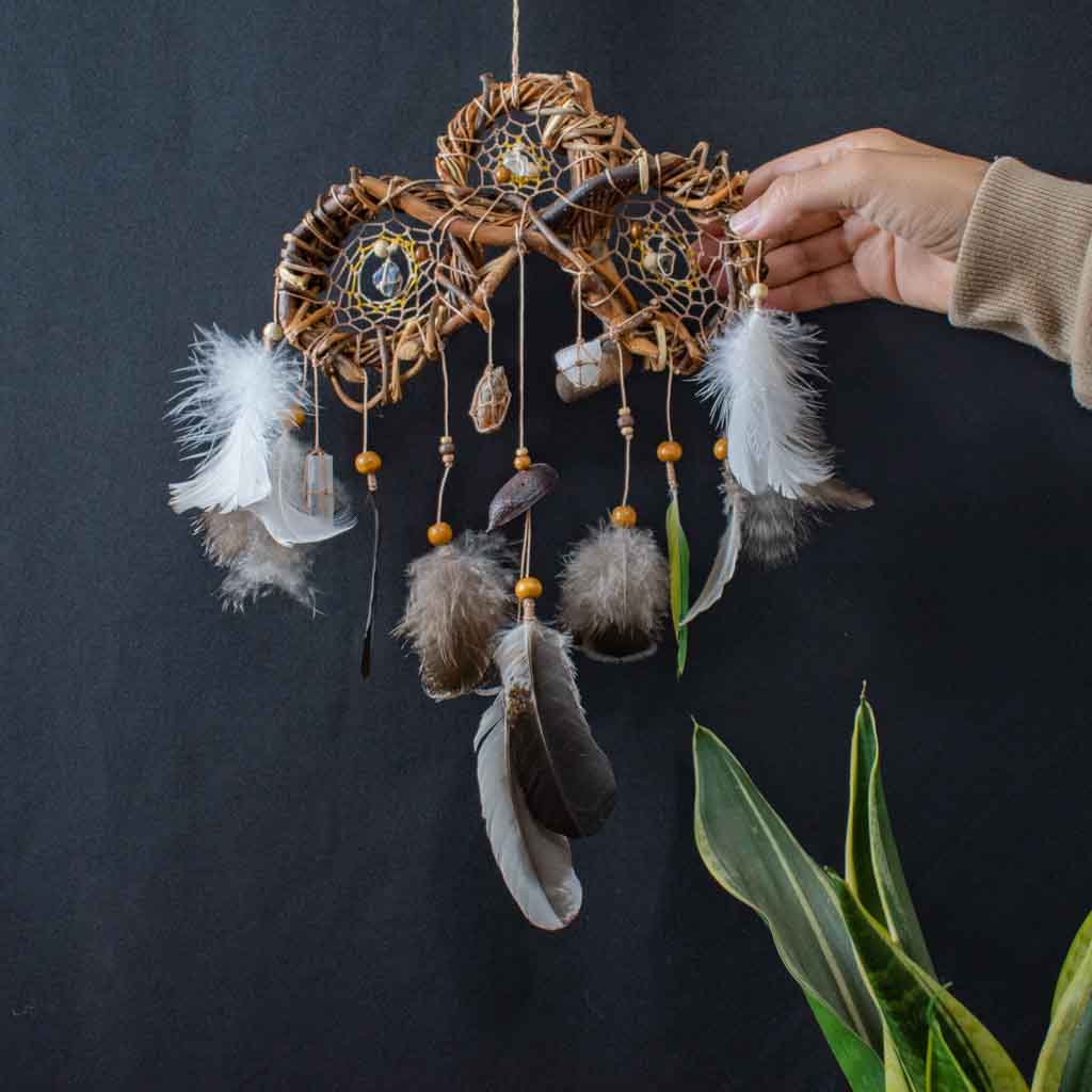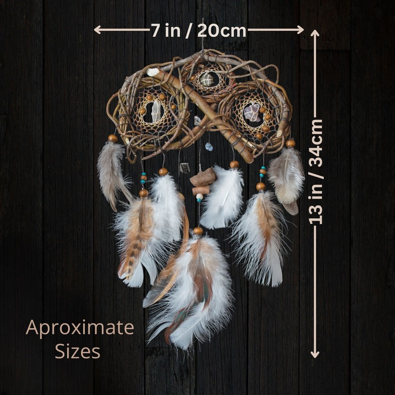 x Este exclusivo mini atrapasueños presenta tres redes tejidas en una sola estructura, perfecto para proteger y decorar espacios pequeños como cunas, coches o rincones especiales. Hecho a mano con materiales naturales, combina tonos blancos y beige con piedras semipreciosas para una energía armonizadora y protectora. Su diseño compacto lo convierte en un amuleto versátil para quienes buscan protección tanto en casa como fuera de ella. Ideal como regalo espiritual, decoración bohemia o como una pieza de energía positiva.