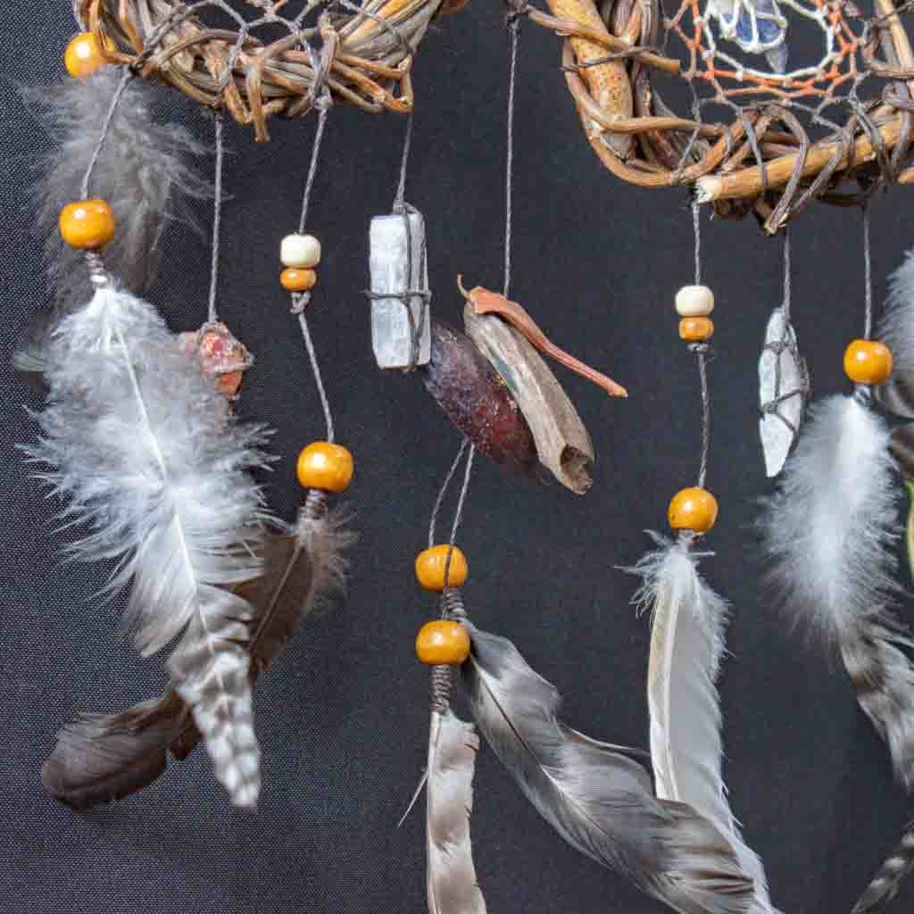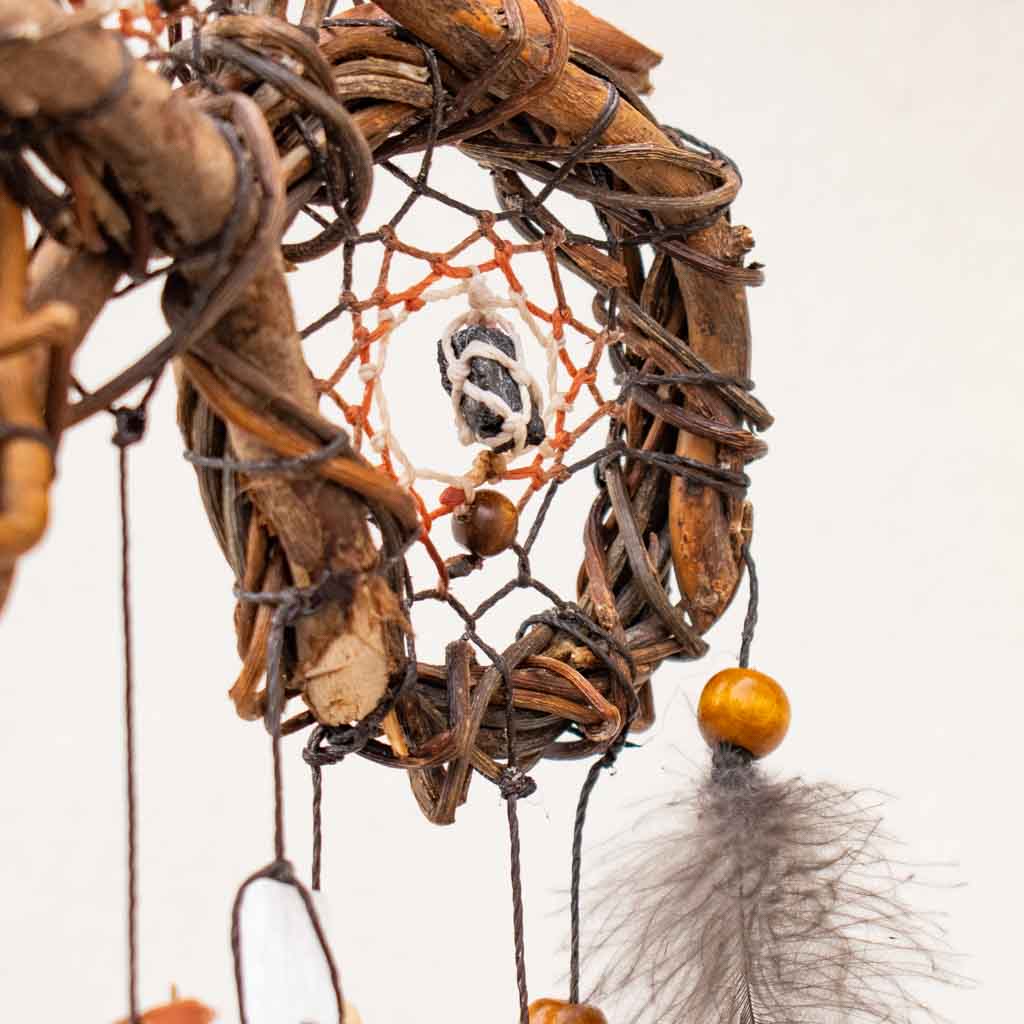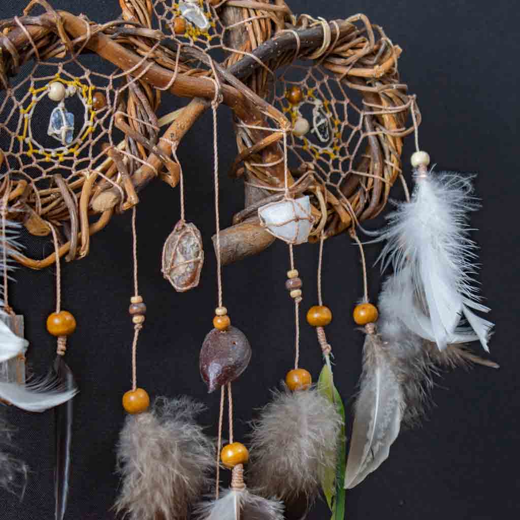x Este exclusivo mini atrapasueños presenta tres redes tejidas en una sola estructura, perfecto para proteger y decorar espacios pequeños como cunas, coches o rincones especiales. Hecho a mano con materiales naturales, combina tonos blancos y beige con piedras semipreciosas para una energía armonizadora y protectora. Su diseño compacto lo convierte en un amuleto versátil para quienes buscan protección tanto en casa como fuera de ella. Ideal como regalo espiritual, decoración bohemia o como una pieza de energía positiva.