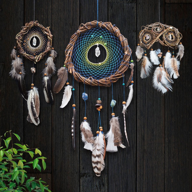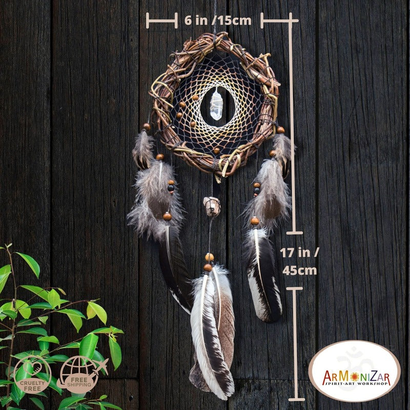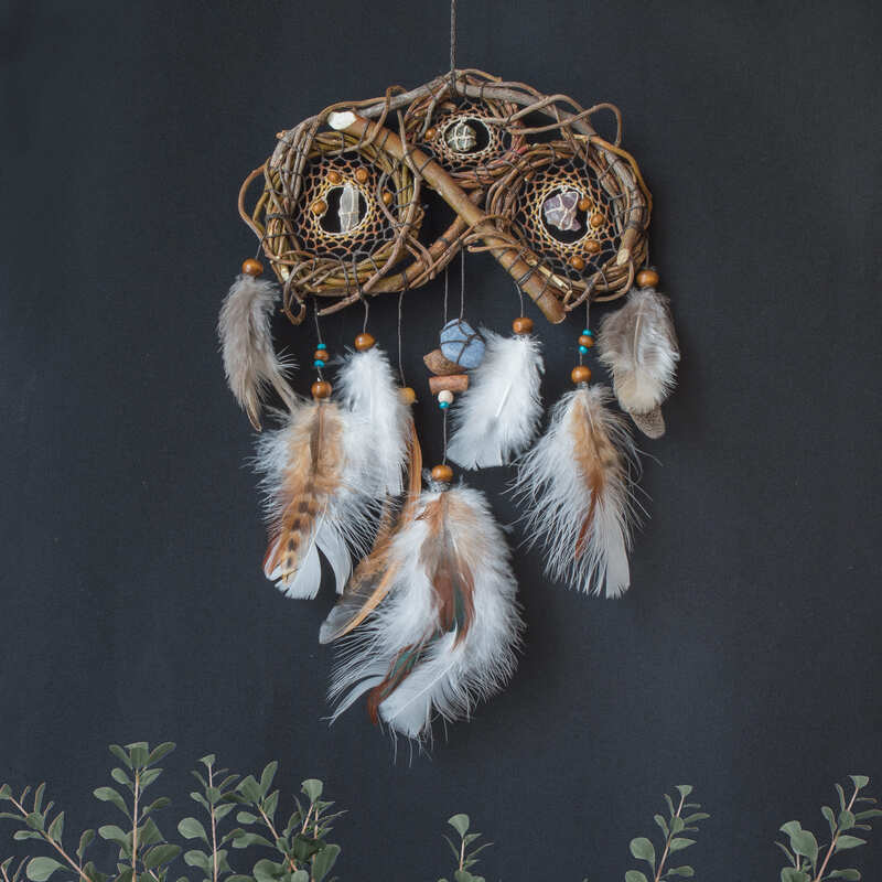 xSleep crystals dreamcatcher for insomnia relief. Anxiety worry stone, prosperity, & empath energy cleanse.ย Made with sustenaible feathers and semi precious stones. Ideal for Indigo wall hanging decor and meaningful gifts.ย